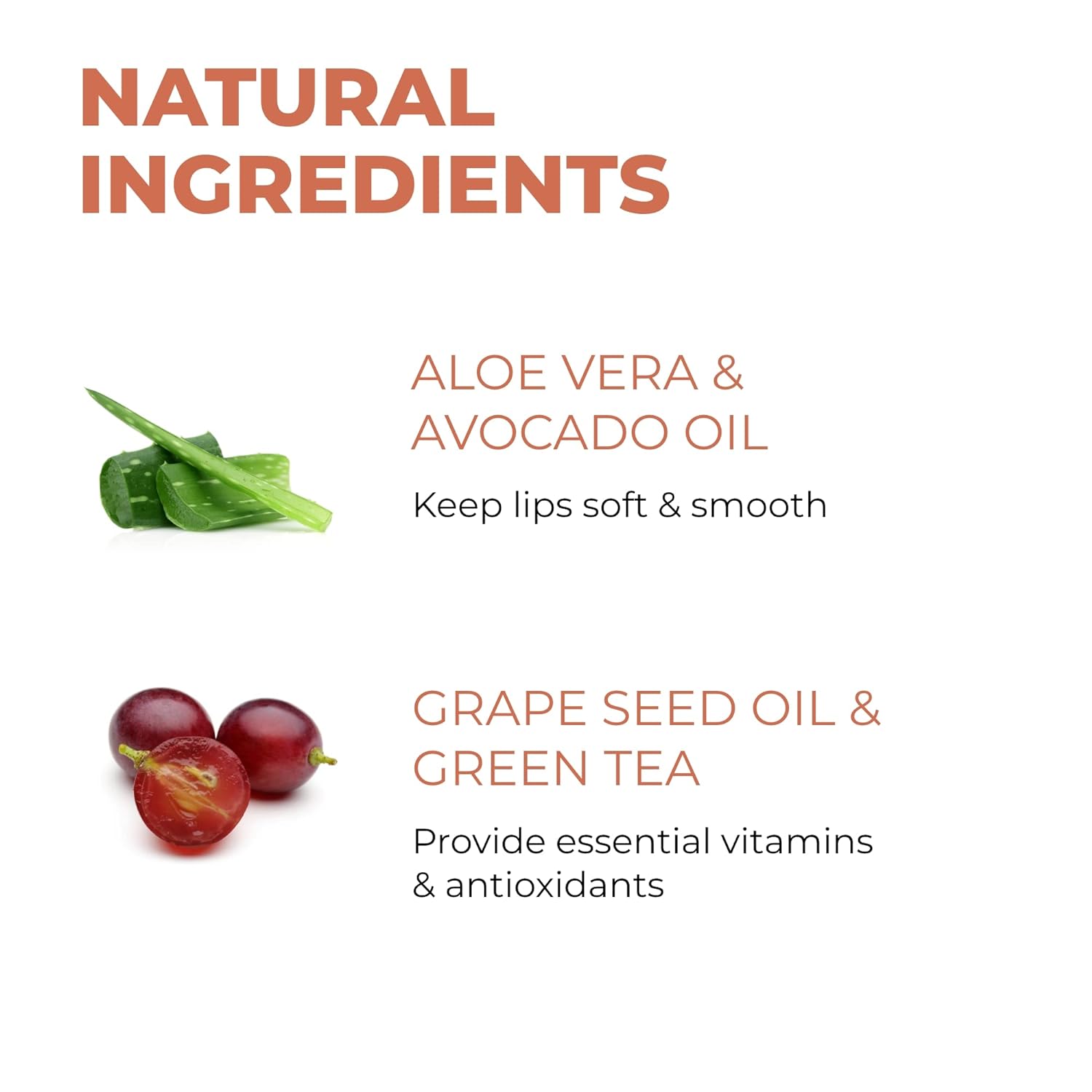 Made from natural ingredients: Aloe Vera and avocado oil to keep lips soft and smooth, grape seed oil and green tea for vitamins and antioxidants