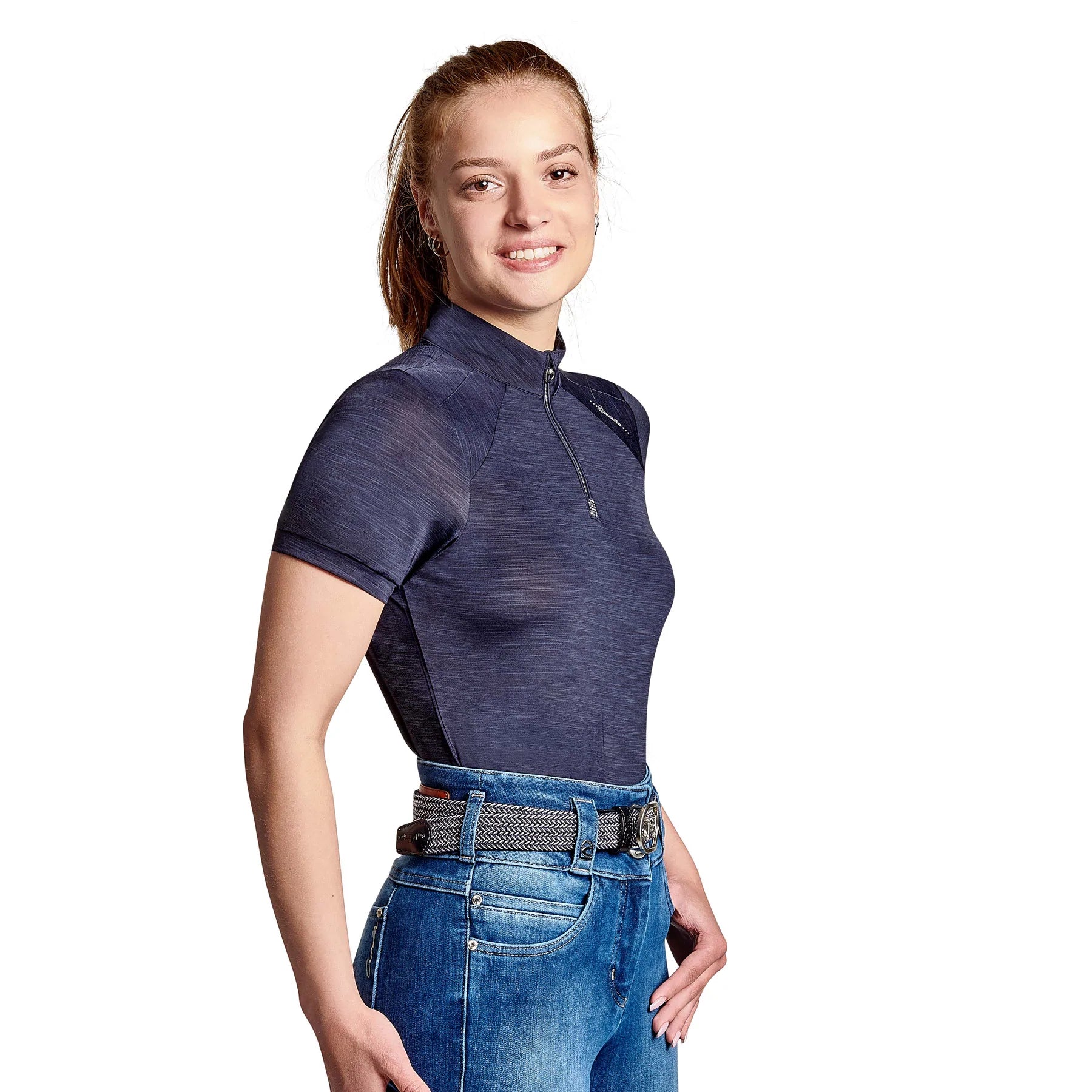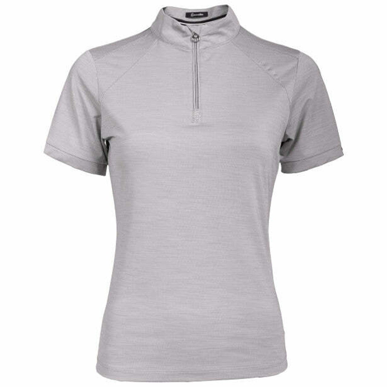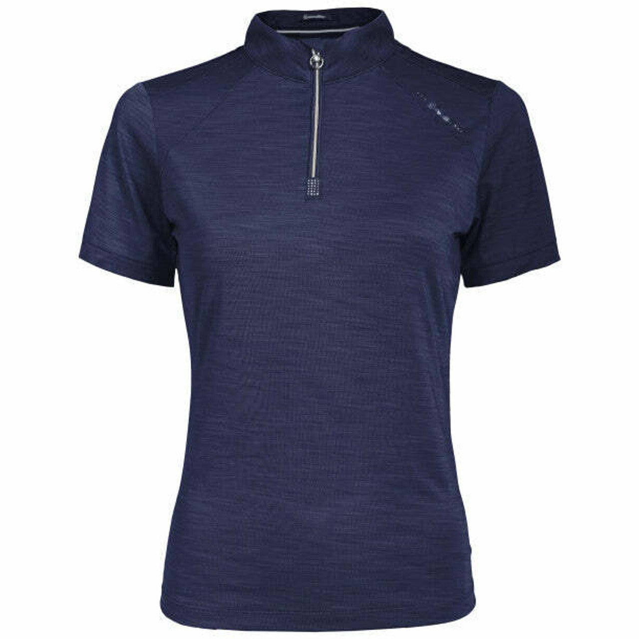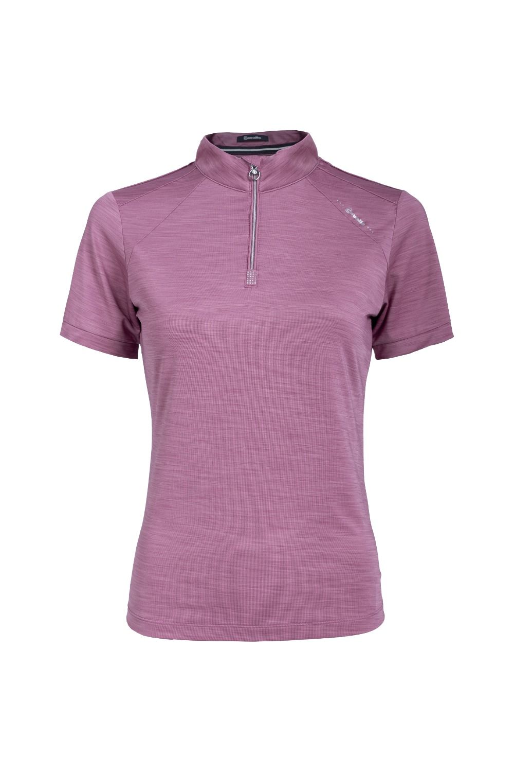Noble ladies stand-up collar training shirt made of functional jersey. Small, shimmering crystals below the zipper and on the left shoulder yoke. Silver Cavallo print on the left shoulder. Fine zipper with Cavallo jewelry handle with crystal. Large, silver Cavallo artwork on the back.