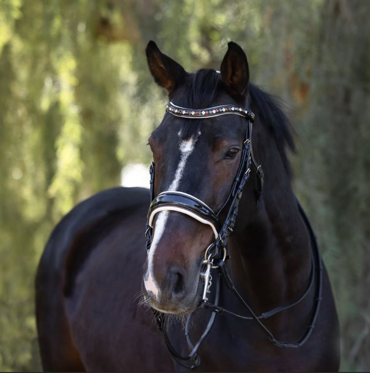 Featuring a plush padded anatomical noseband, mono crown headstall, brass hardware, and a gorgeous matching browband!