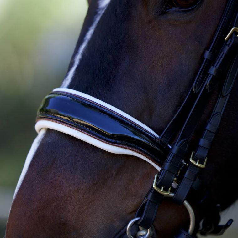 - Black patent noseband with cream padding and rose gold piping