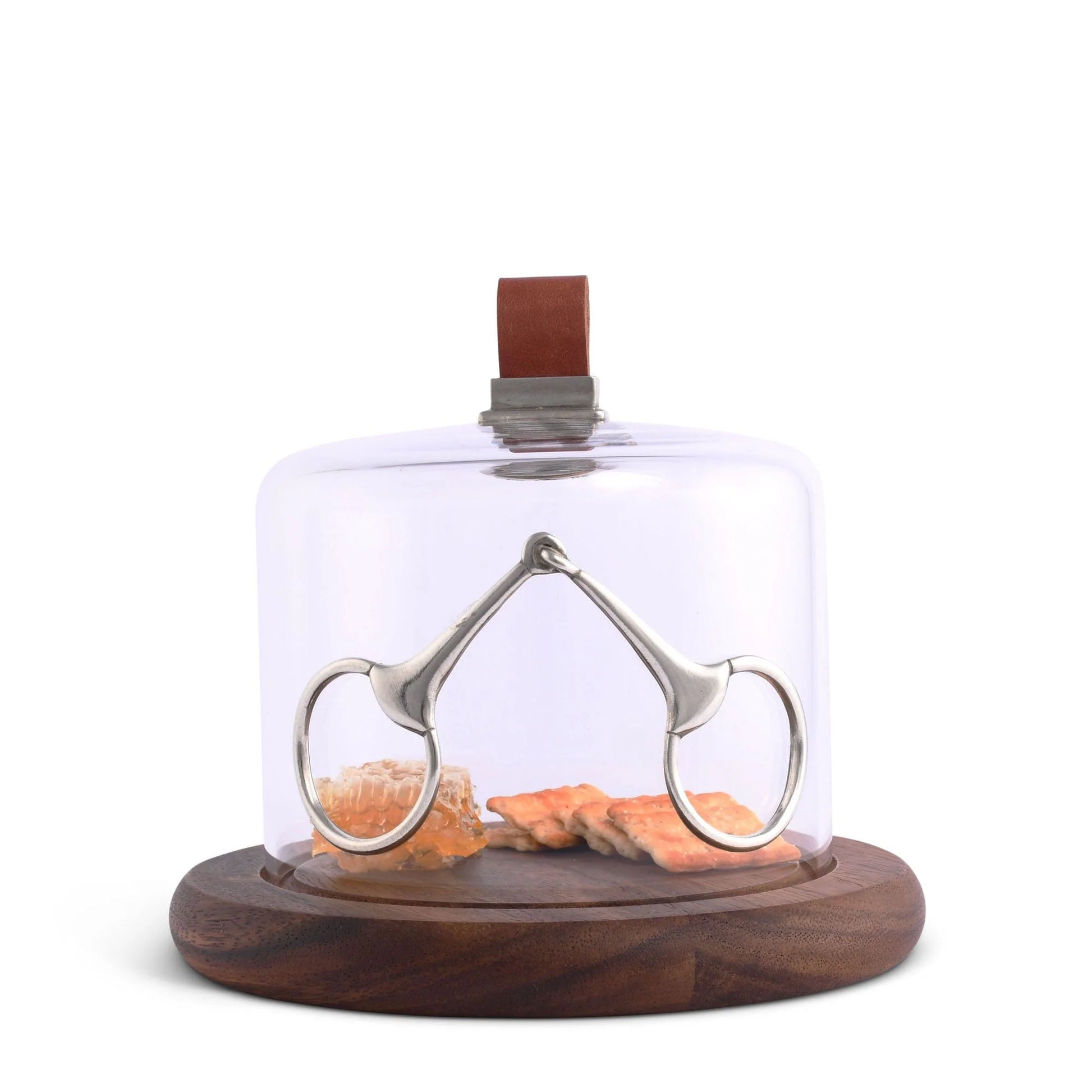 Add an upscale flair to your parties, housewarmings, weddings or babyshowers with Vagabond House's elegant and high quality glass cheese / dessert stand. Made from hand-blown, sturdy glass combined with artfully hand-crafted solid and leather horse bit decor, this stand will draw admiring eyes to your tasty creations, without overpowering them. Choose from two heights of glass stands or the flat wood board. Mix and match to form multi level display.