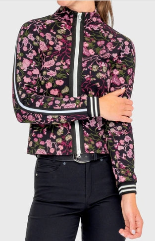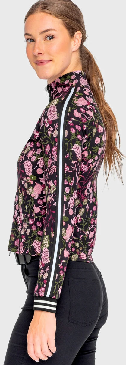 Ready, set, go! This season’s track jacket will take you from the barn, the green, the court and beyond. Featured in our signature modern begonia print, and Plain Black this soft, midweight track jacket is both contemporary and very practical. Two front pockets, black and white stripe details down the sleeves, at the cuffs and framing the full zipper, UPF 50.