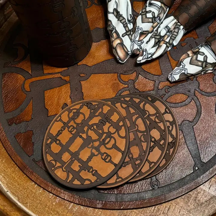 4” Diameter, Heavy Leather coasters with my signature, authentic Art snaffle Bit Design coordinates beautifully with so many of my Snapple bit equestrian, designs, and home decor. Handmade, classy and elegant. Check out my coordinating leather products and coordinating art printed home decor products. Not only is this an elegant way to celebrate any party, equestrian or otherwise, it is fun and different!.