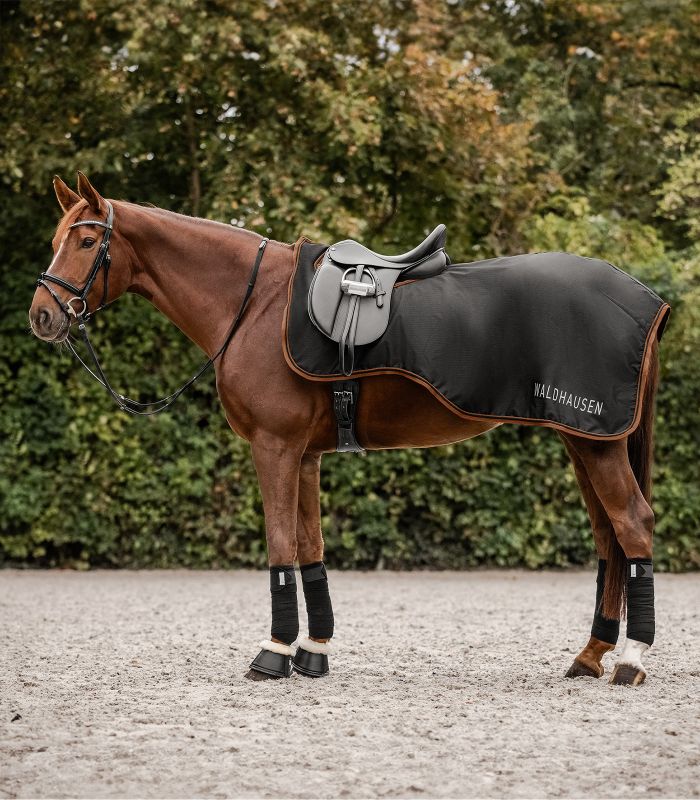Waterproof, 600 denier exercise sheet with warming 50g/m² filling. The reflective lettering of the Waldhausen logo ensures good visibility. With a cut out for English saddles. Touch tape fastener in the withers area for ease of attachment.