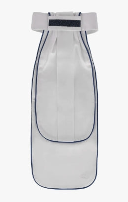 This satin stock tie has a beautiful glitter finish, a trim, and an embroidered 'Q' at the bottom. It is easy to fasten with a hook-and-loop fastener.