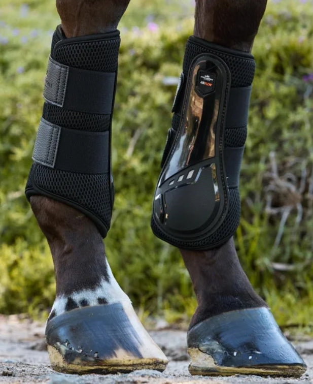 The technical training boots Air Flow Training Boots by Schockemöhle Sports are a must-have for every training session! The inside of the front legs is protected by a hard shell, while the mesh fabric and the bamboo lining ensure temperature equalization thanks to the ventilation holes around the horse's leg. The Air Flow Training Boots are breathable and permeable to air. The training boots are visually rounded off by the logo on the inside and the imitation leather fastening.