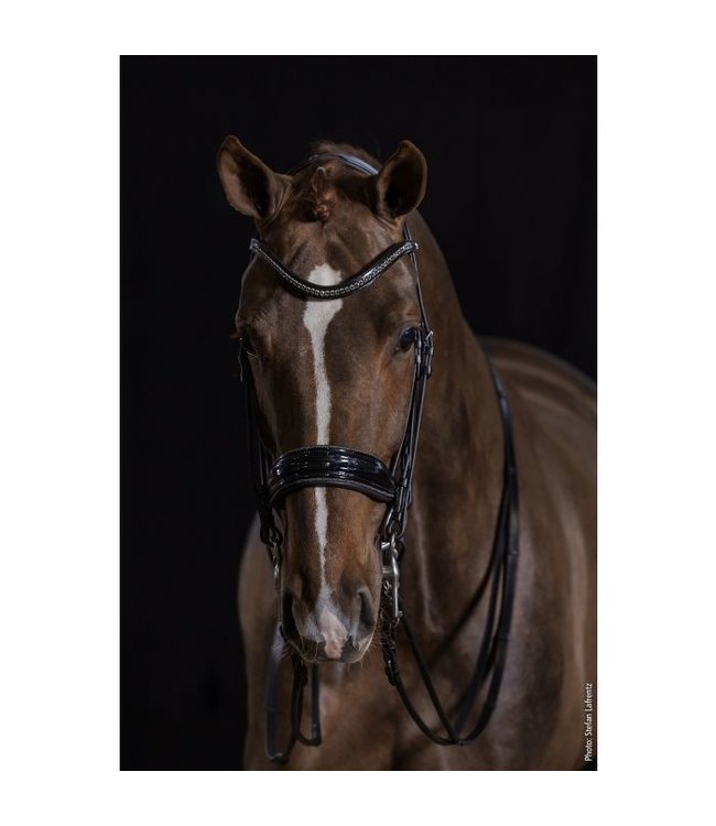 This bridle comes with a rhinestone front strap and a patent leather noseband with rhinestones all around, giving the bridle a luxurious look. The bits are attached to the bridle with blind fasteners, providing a neat and professional look. The bridle comes without reins, giving you the freedom to choose which reins suit you and your horse best.