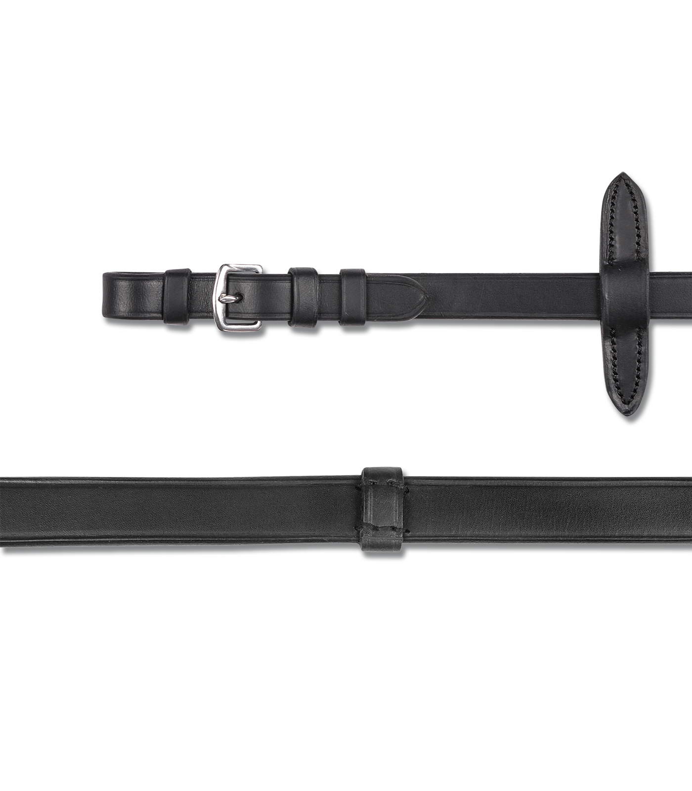 Soft leather reins with rubber coating on one side and stitched-in leather stops with calfskin covering. With martingale sliders and stainless steel fittings. Hook stud ends